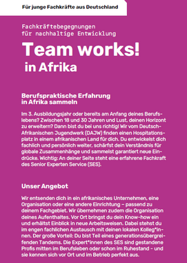 Das Infoblatt informiert Auszubildende und junge Fachkräfte und beantwortet die Kernfragen zur Programmlinie "Team works!" des Deutsch-Afrikanischen Jugendwerks (DAJW).